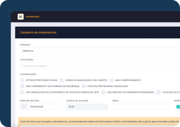 Registre advertências com histórico, motivo, responsável e colaborador envolvido. Tudo fica salvo de forma segura e organizado para consultas futuras.
